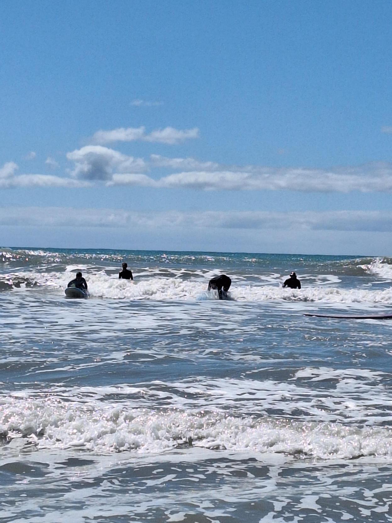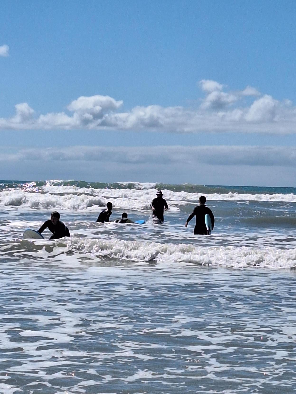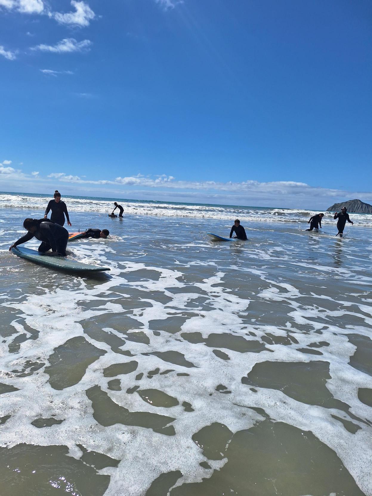 Our pool day created a calm and supportive space where rangatahi could build skills safely and learn at their own pace in a more controlled environment, before heading into the ocean. When it came time to hit the beach, conditions were perfect. Before paddling out, everyone covered the basics again – how to anchor their board, position themselves safely, and catch a wave.